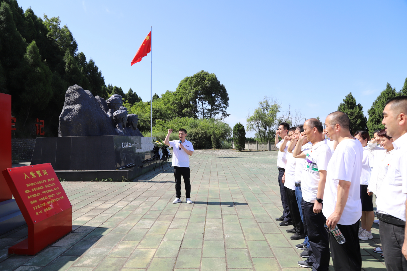 活動中,全體黨員瞻仰了紀念碑林、參觀了飛龍山蘇維埃政府舊址和紅軍紀念館,聆聽了講解員講述當年紅軍來到飛龍山駐扎、戰(zhàn)斗和生活并號召窮苦百姓進行革命、建立蘇維埃政權(quán)的故事。在飛龍山烈士公祭廣場,全體黨員向革命先輩們敬獻了鮮花并集體默哀。隨后面向鮮紅的黨旗,重溫了入黨誓詞并為黨員送上了“黨員生日賀卡”。