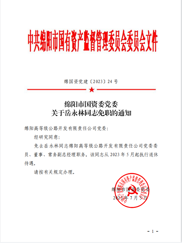 綿陽(yáng)市國(guó)資委黨委《關(guān)于岳永林同志免職的通知》