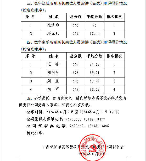 關于公司中層管理人員公開競爭上崗測評成績的公示